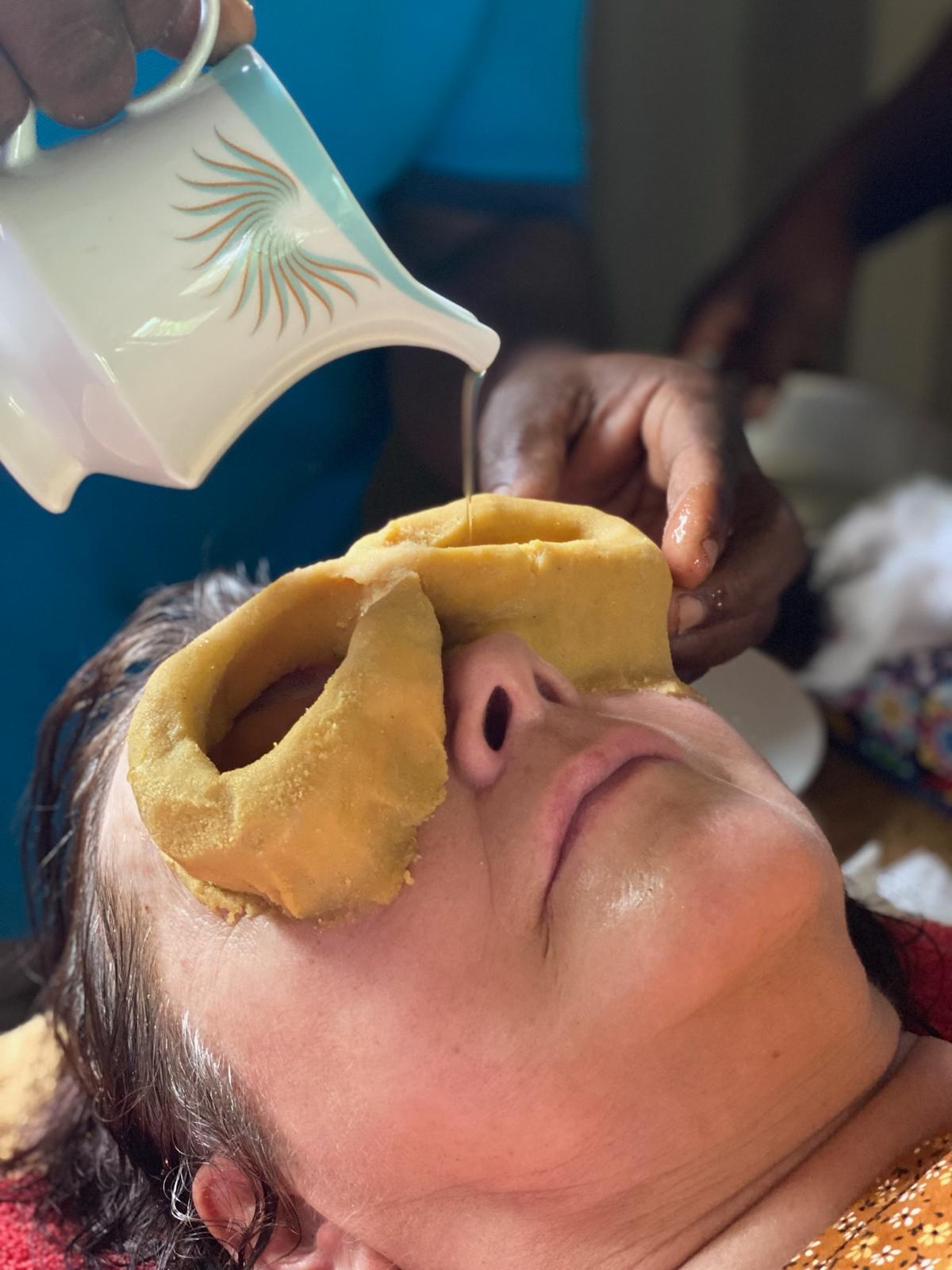 💧 Širodhara: Jemný proud teplého oleje stékající na čelo přináší hlubokou relaxaci, zklidňuje mysl a posiluje nervový systém.